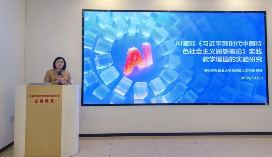 11月29日,全国职业院校“大思政课”品牌建设研讨会在天津召开。会议由教育部高校思政课教学指导委员会“高职高专思政课”分教学指导委员会主办。我校马克思主义学院教师杨玲提交的论文《AI赋能〈习近平新时代中国特色社会主义思想概论〉实践教学增值的实验研究》成功入选会议论文集(全国仅收录22篇),并受邀作主题汇报。 另外,马克思主义学院陶慧和王鎏燚老师合作的《中医药文化融入医药类职业院校“大思政课”实践教学的价值、逻辑与路径——以浙江药科职业大学为例》也受邀参会。