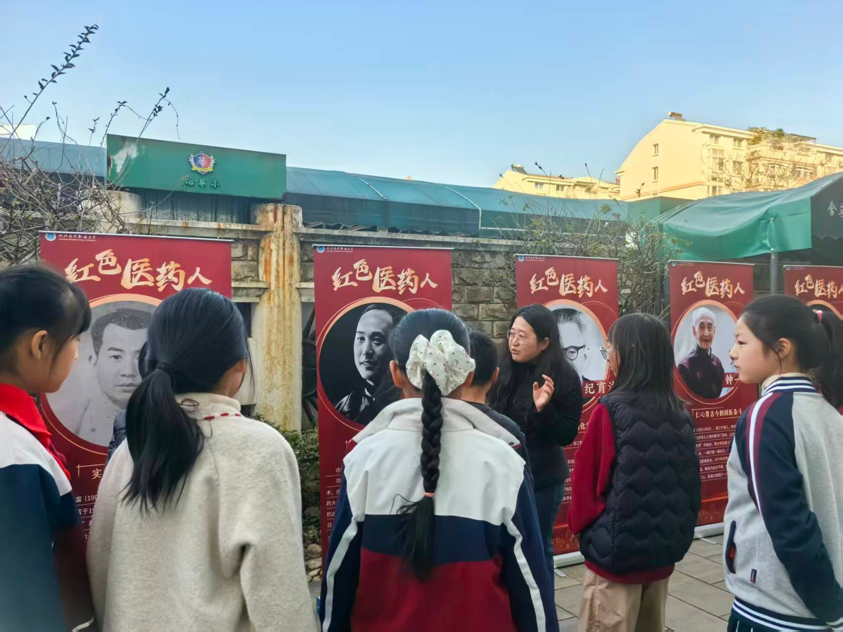 本次活动通过“移动展览+生动讲解”的形式,让红色历史可触可感,让奉献精神入脑入心。展板聚焦于十位来自浙江,在中国革命、建设与改革历程中作出卓越贡献的医药卫生工作者。他们中既有战争年代救死扶伤、投身革命的医务战士,也有和平时期攻坚克难、造福人民的科学家与模范。每一面展板,都通过珍贵的历史图片、精炼的生平介绍和动人的事迹节选,勾勒出一位“红色医药人”将个人理想融入国家命运的鲜活画像,集中展现了浙籍先驱的红色根脉、家国情怀与专业奉献。在古林职业高级中学,展览现场变成了连接历史与现实的育人课堂。教师们通过巧妙解读,将红色医药先驱身上体现的精益求精、极端负责、勇于创新、无私奉献的精神品质,与职业教育所倡导的“工匠精神”和“职业道德”深度融合,引导学生们思考:无论未来身处何种行业,精湛的技艺、严谨的作风和深厚的家国情怀,都是成就事业、实现价值的基石;在鄞州区华泰小学,展览调整为更富趣味性与互动性的版本。教师们用孩子们听得懂的语言,讲述先驱们从小立志、刻苦学习的故事,并巧妙联系健康生活、科学探索等主题。孩子们围绕着色彩鲜明的展板,好奇地询问图片细节,对先驱们的故事表现出浓厚兴趣。“原来我们宁波出了这么多令人敬佩的英雄!”一位小学生兴奋地说。这种直观形象的展示,在孩子们心中悄然播下了崇敬榜样、向往奉献的种子。